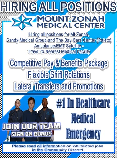 Mt.Zonah Medical Center - EMS Mt.Zonah is the primary medical group facilitator. The State Medical Director and Command operate from the facility located in Los Santos and provide the training for the medical group professionals in Paleto and Sandy Shores. Mt.Zonah has state of the art facilities, Surgery Clinic, and Long Term Recovery Center.